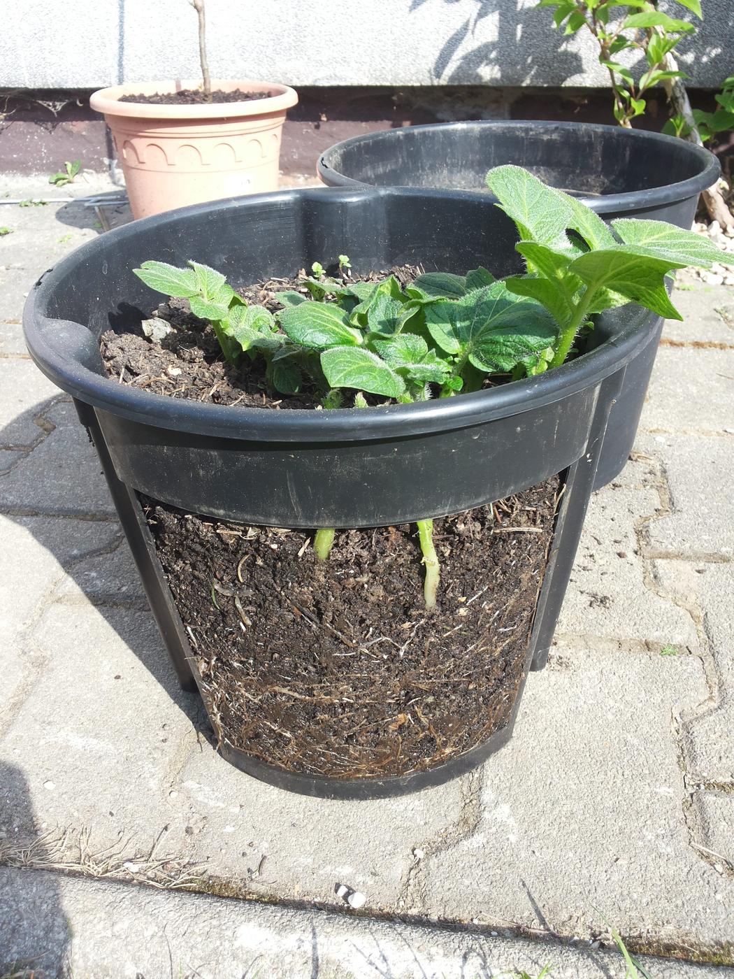 Ist der Eimer oder der Blumentopf voll und die Kartoffel schaut wieder aus dem Boden, lassen Sie die Kartoffel einfach wachsen.