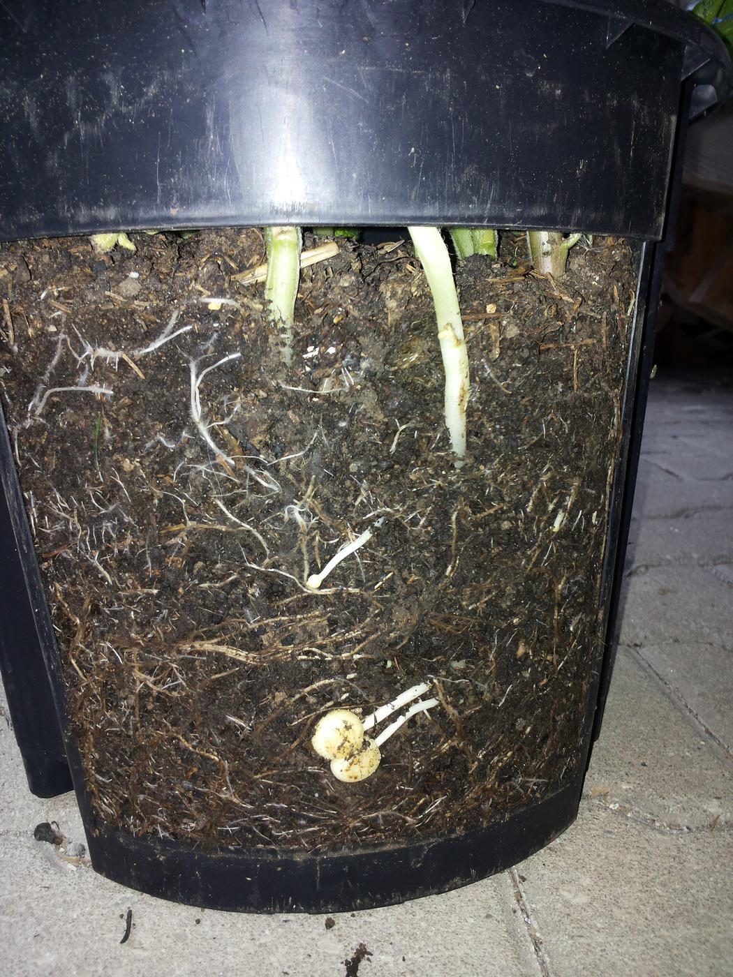 Kleine Kartoffeln wachsen im Kartoffeltopf