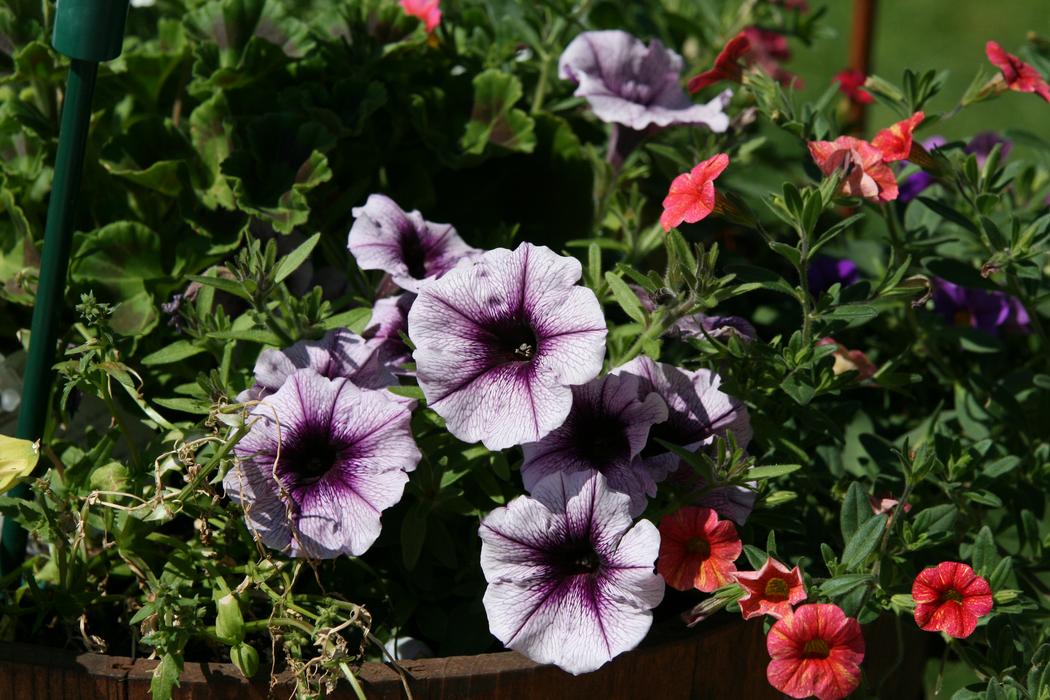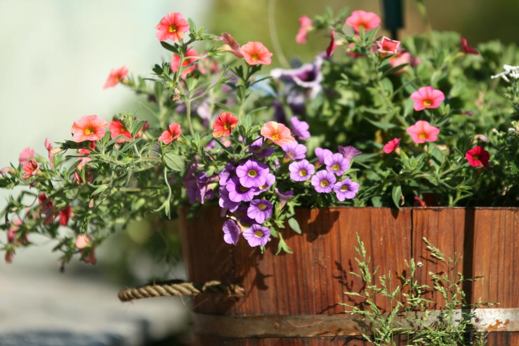 Petunie und Millionbells im Holztopf