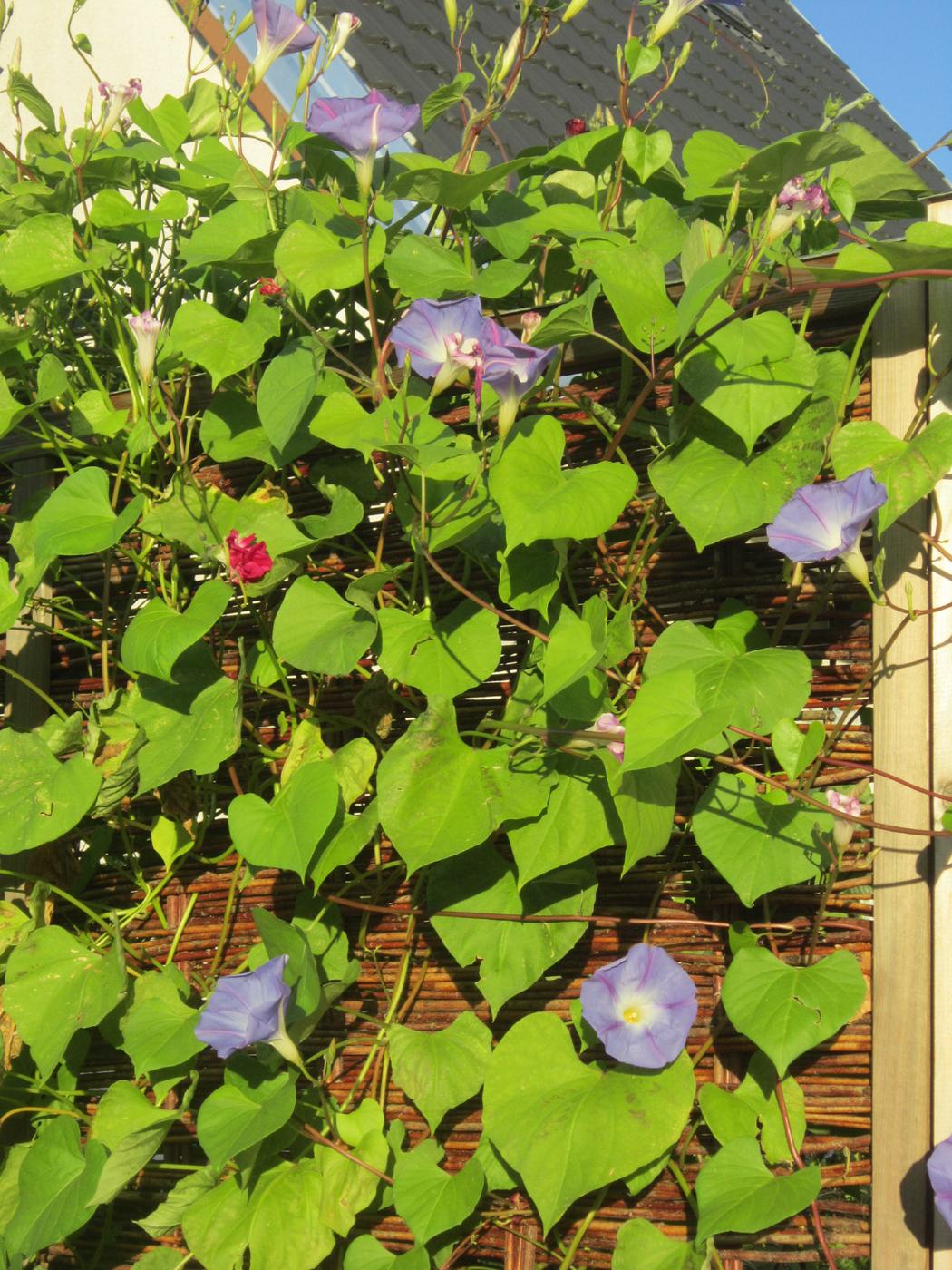 Auch wenn die Pflanze bereits gewachsen ist und an Höhe gewonnen hat, sollte sie nicht austrocknen. Trockenheit quittiert die Prunkwinde mit hängenden Blättern und mangelndem Blütenwachstum. Hier konnte ich darüber hinaus beobachten, dass die Blüten häufig an den horizontal wachsenden Trieben ansetzten, während die hochwachsenden Triebe weniger Blüten vorwiesen.