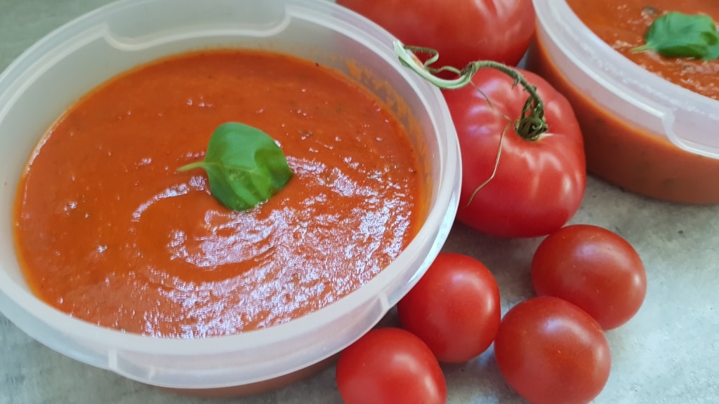 Diese Sauce dient nun als Grundlage für Pastasaucen, Pizzasaucen oder oder oder! Natürlich kann man sie gleich frisch weiter verwenden, aber wer sie gerne haltbar machen möchte, kann die Tomatensauce nun entweder portionieren und eingefrieren oder sie werden in sterilisierte Gläser gefüllt und im Backofen oder im kochenden Wasser circa 40 Minuten eingekocht. Dann ist die Sauce auch rund 12 Monate haltbar!