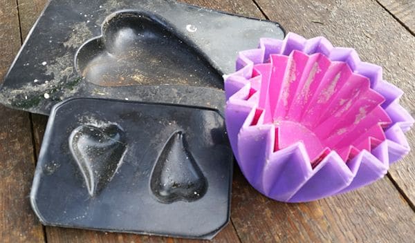 In den Anfängen benützen Betonfreunde gerne vielfältige Kuchenformen aus Silikon, die es auch in verschiedensten Formen gibt: Rosen, Blüten, Figuren etc. Diese können gut verwendet werden, jedoch benötigen sie meist auch ein Sandbett, um nicht “aus der Form zu geraten”. Und: ordentlich Fetten mit Öl ist vor dem Begießen mit Beton Pflicht!