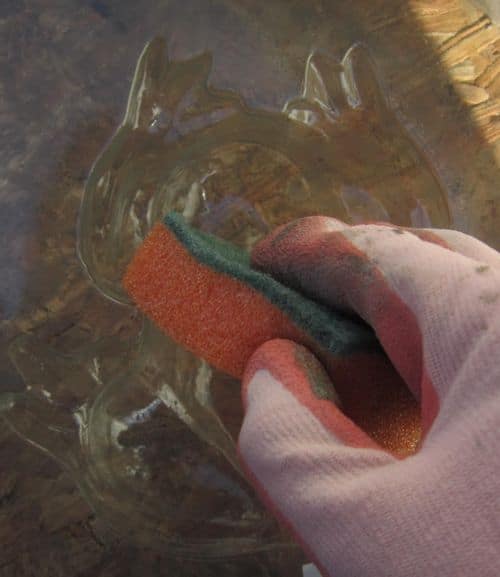 Reinigt alle Utensilien schnell mit Wasser. Der Beton zieht schnell und die verwendeten Eimer oder der Rühraufsatz der Bohrmaschine härten im Nu mit den Beton aus. Daher alles gründlich und zügig nach dem Ausgießen reinigen. Eine Wurzelbürste oder ein grober Schwamm können hierbei wertvolle Dienste leisten.