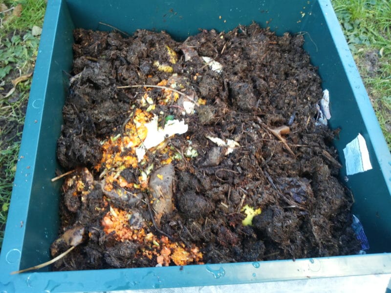 Bioabfälle haben inzwischen 3 von 4 Steigen des Wurmkompost gefüllt und die Dendrobenas und Kompostwürmer vermehren sich offensichtlich fleissig, dank des reichhaltigen Futterangebotes von Kaffeefiltern, Bioabfällen und gut gemeinten Pappschachteln, um das nasse Areal der Würmer einigermaßen in Schach zu halten.